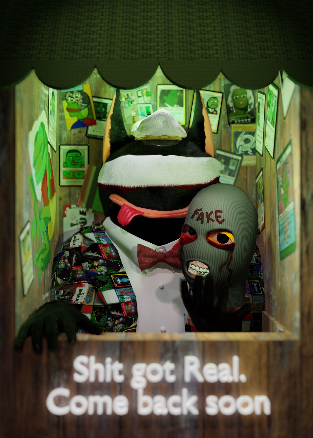 Scrilla was having difficulties managing the website, so he recruited the Austrian Connect and his wife take over that shit. He was sorting through hundreds of submissions using a proton mail account, which is garbage even if you know how to use email. Scrilla is first and foremost, an artist and musician… the technical stuff… not his forte. He needed a Queen of Cards to help curate the collection and a Meme Lord Tech Guru to elevate the website and keep the chat fakeasf. Enter Fake Annie and Indelible. Shit ran smooth for maybe a week, but ultimately, they were hacked by a team of Eastern European gangstas – the squad called themselves La Fake Nostra – around Series 2. They threatened the team, stole their memes and overtook the chat… they had DJPEPE at gun point and made him give up password access to Fakes.